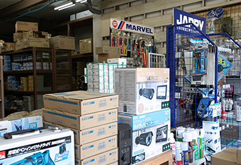配線器具・照明・空調・ケーブル・工具など、電気工事に関わるあらゆる資材を一括でご用意しています。