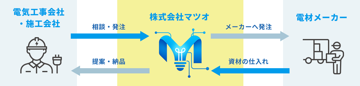株式会社マツオは、電設資材の総合卸業として、電気工事に関わるあらゆる資材を取り扱っています。
